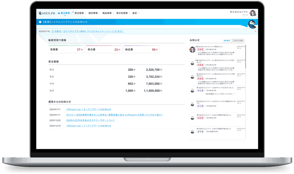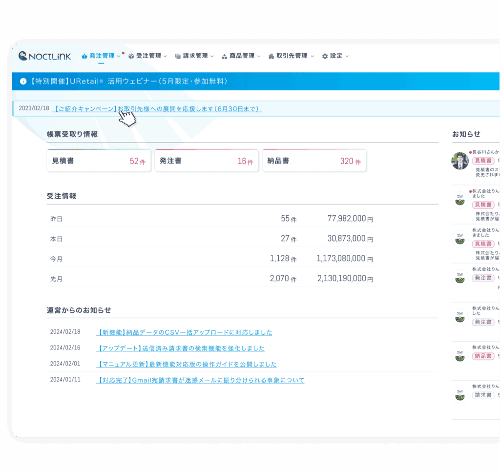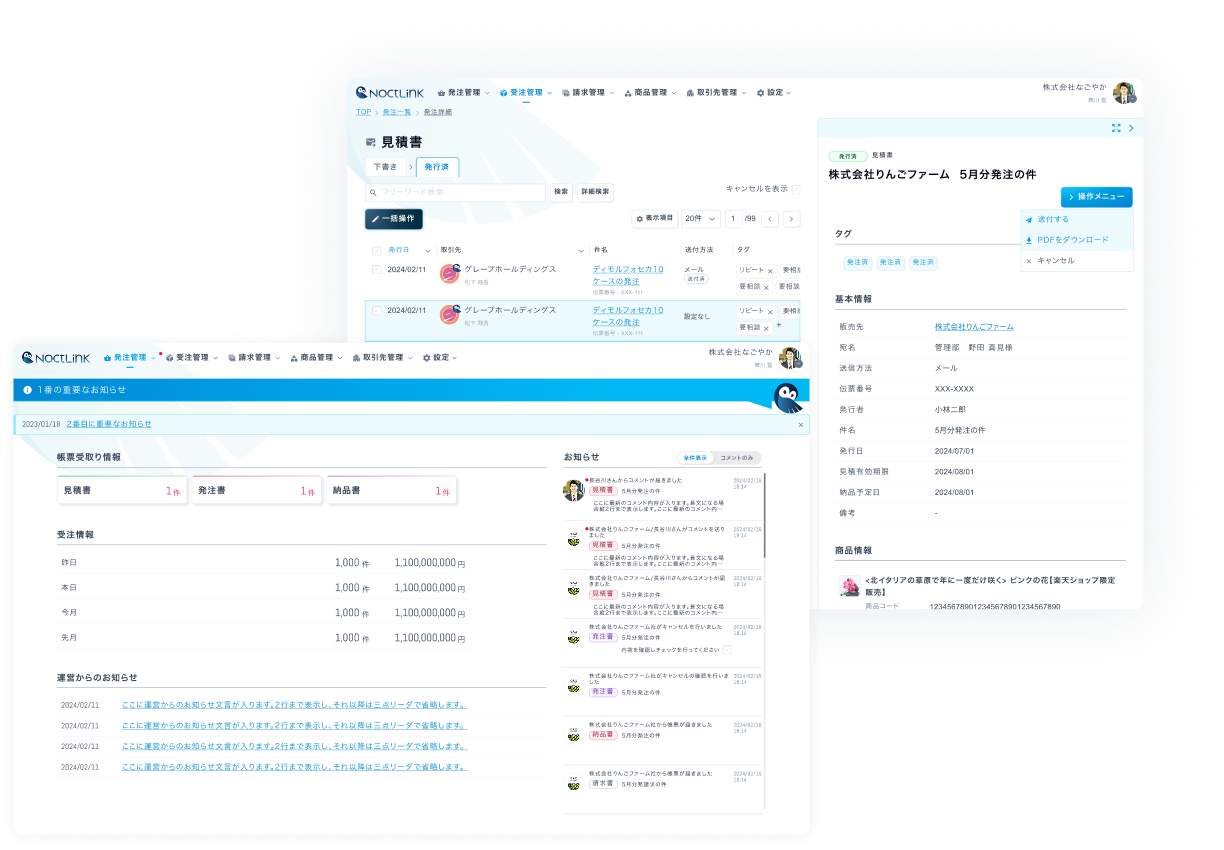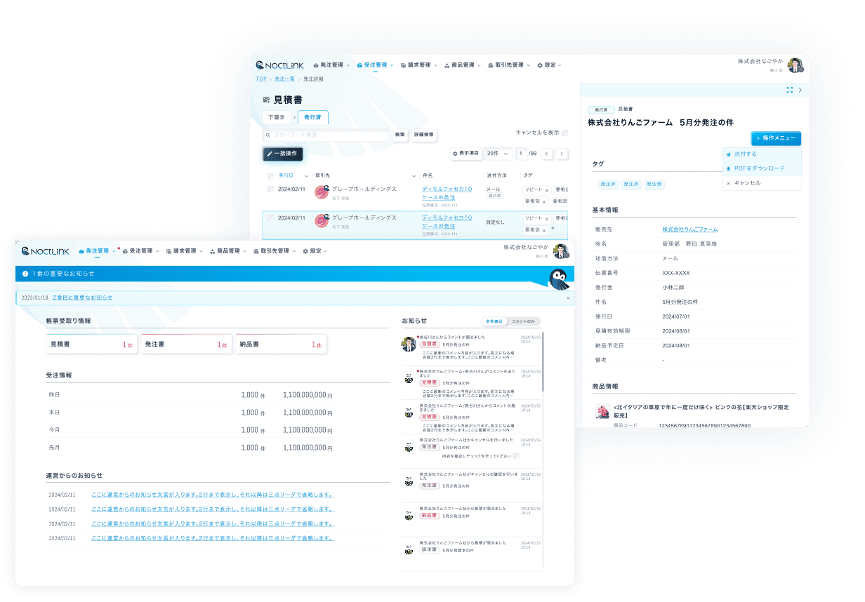 ノクトリンクは、見積・受発注・納品・請求といった一連の帳票作成から、取引先ごとの進捗管理までを一箇所で完結できるクラウド型の取引管理プラットフォームです。従来はExcelや紙、メール、FAXなど複数の手段を使い分けていた業務も、ノクトリンク上で統一・効率化されることで、属人化や転記ミス、二重対応といったリスクを大幅に軽減できます。