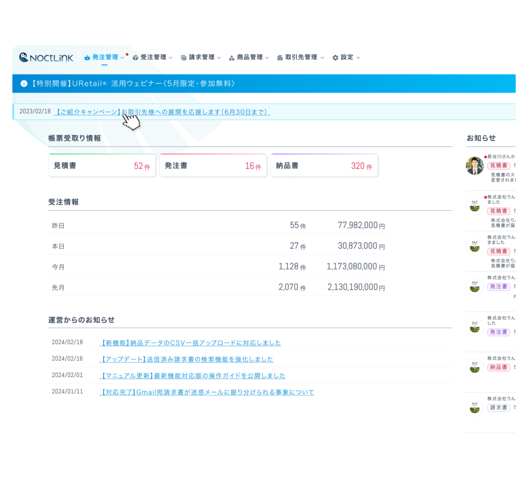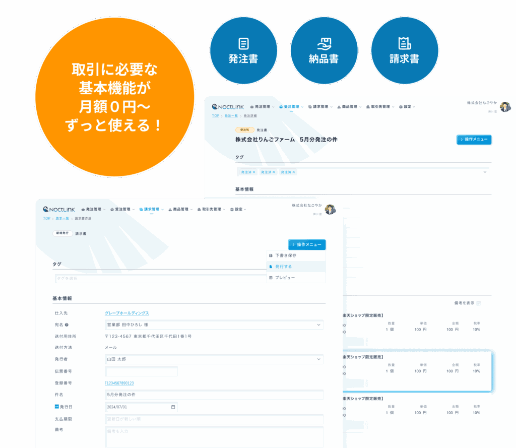 ノクトリンクは、こうした課題を解決するために「取引先と一緒に使える」ことを前提に設計されたツールです。無料から導入できるため、自社だけでなく取引先への展開もしやすく、業務全体の統一が図れます。受発注から請求までの一連の帳票処理をノクトリンク上で完結でき、利用企業が増えるほど社内の個別対応は不要に。企業間取引をもう一段階、効率化させることができます。