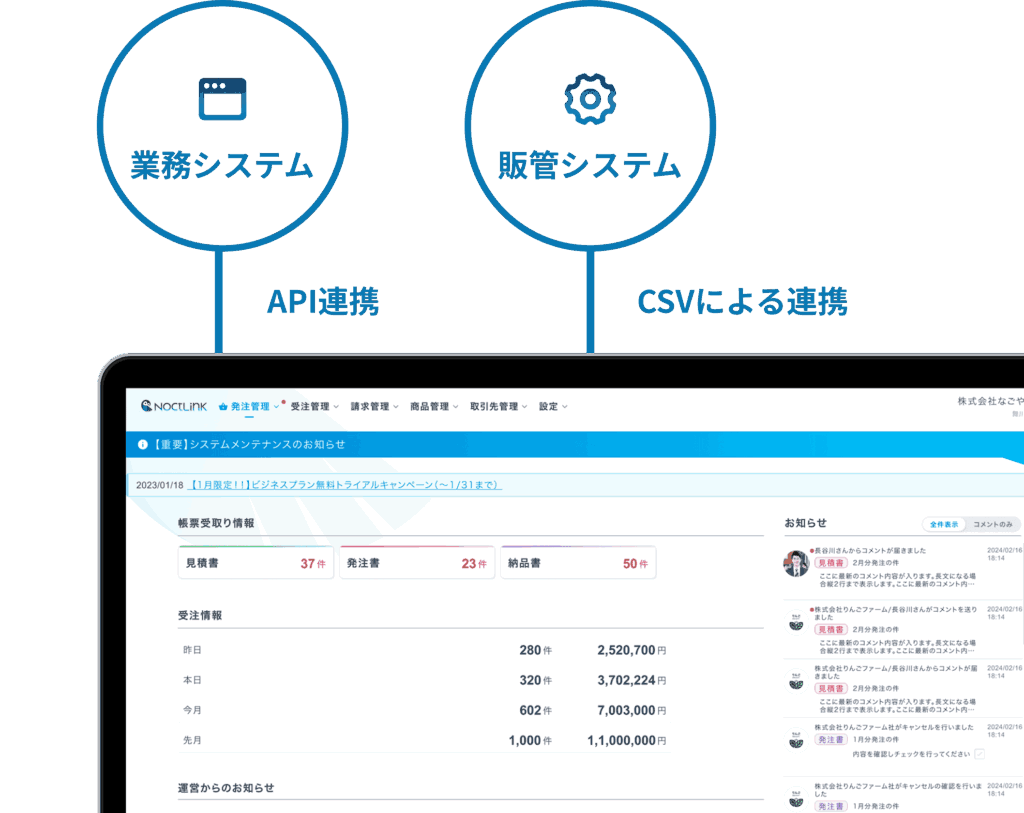 APIやCSVを用いて自社でお使いの既存の業務用システムや販管システムと柔軟に連携が可能です。API連携を使えば、インターフェースはお使いの既存システムそのままに、裏側でノクトリンクが稼働し、帳票の入出力や送付・管理が可能に。業務フローを変えずに企業間取引のオンライン化を実現します。