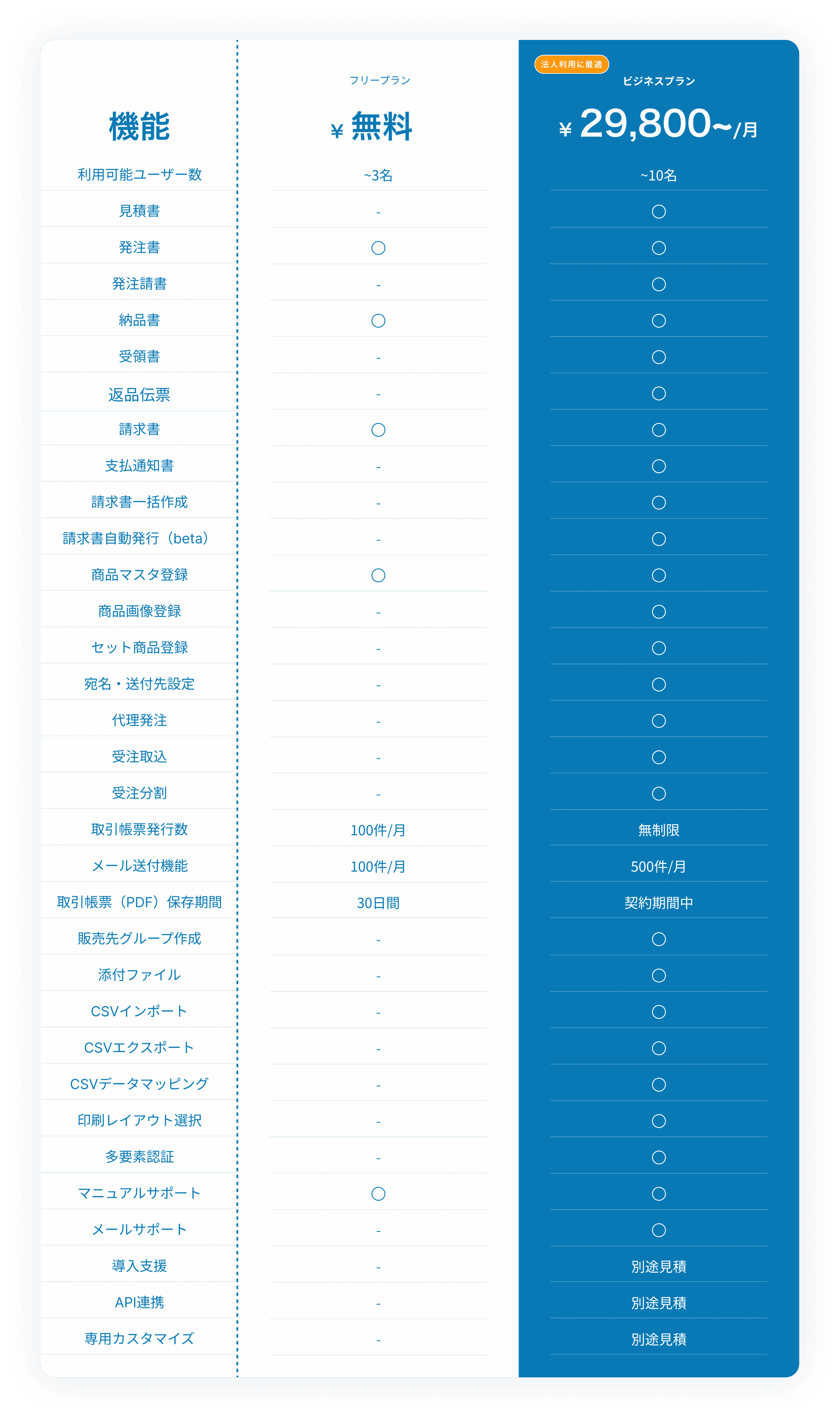 ノクトリンクは基本機能を無料プランとして提供しており、初期費用の心配なくサービスを試用することができます。『多額の予算を使ってシステムを導入したものの失敗してまった…』『導入後の現場負担が想定より大きかった…』。このような事態を未然に防ぐことができるため安心して導入いただけます。また、取引のフルデジタル化に向けて取引先に使ってみてほしい場合にも、導入費用の負担なく展開が可能です。
